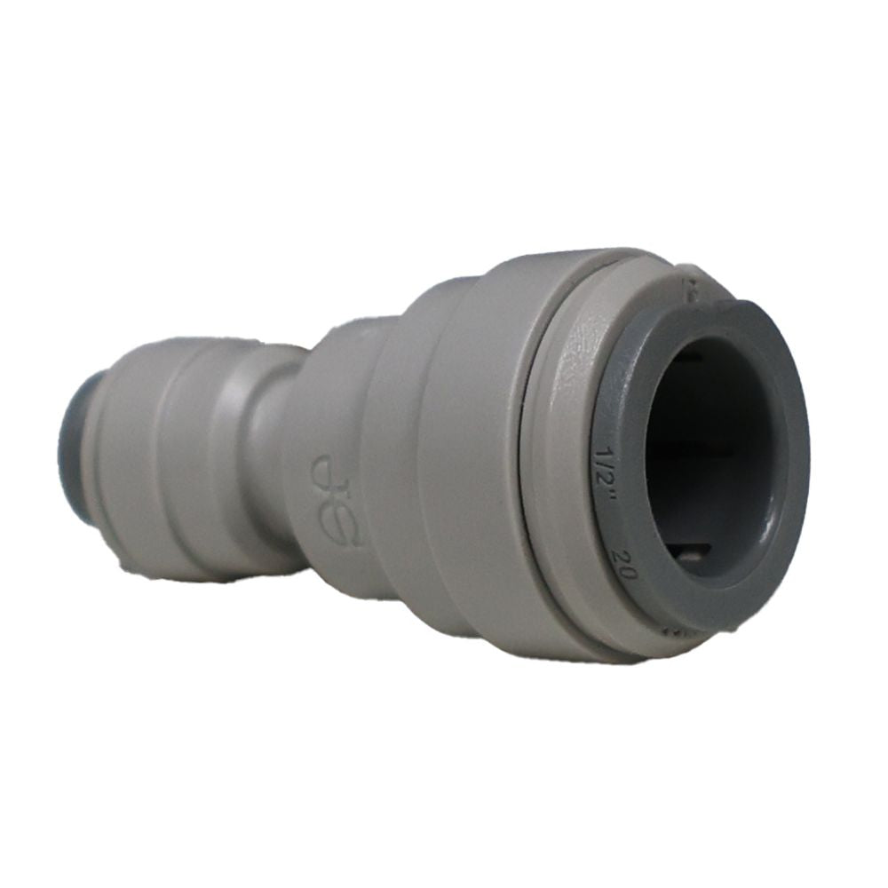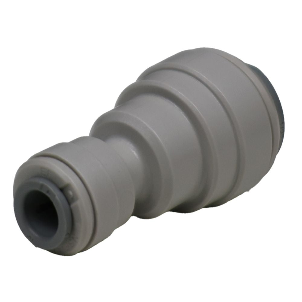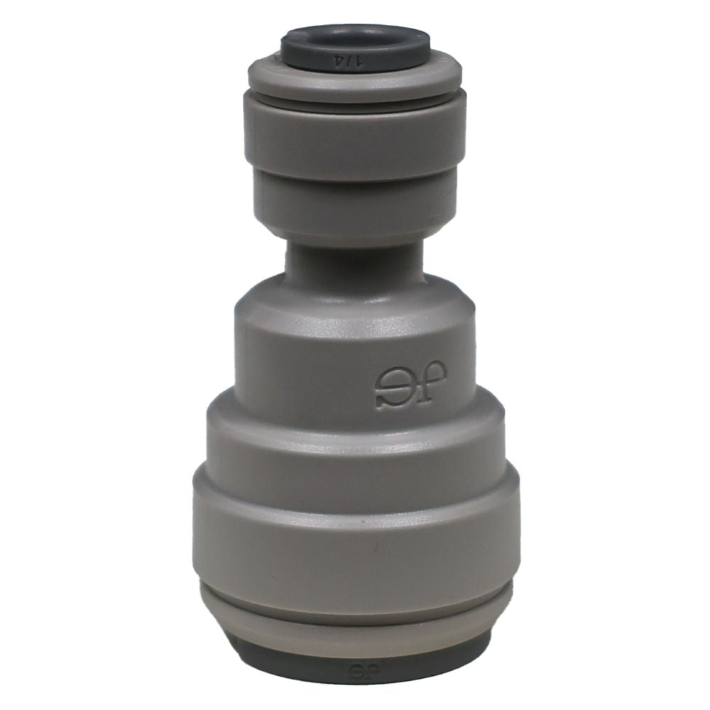 The John Guest reducing union connector makes connecting OD tubing sizes quick and easy. Manufactured in gray acetal with food grade nitrile O-ring, these fittings are suitable for food, beverage, and potable liquids. They are also suitable for air and inert gases therefore can be used for CO2 and nitrogen beverage gas lines, pneumatics, vacuum as well as other applications.