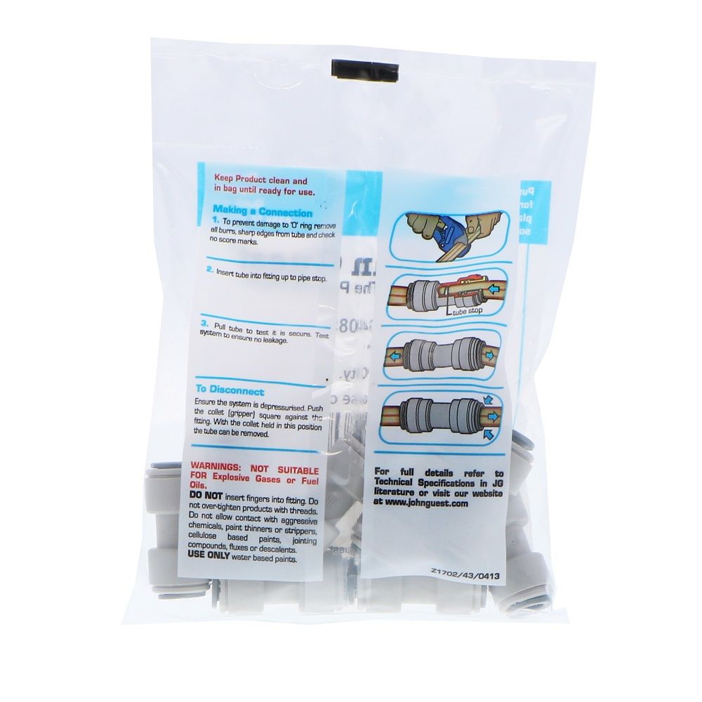 The John Guest push-fit Union connects makes connecting OD tubing sizes quick and easy. The unique collet locking design firmly and securely holds the pipe in place without deforming the pipe or restricting flow. Fittings are corrosion resistant and fully removeable, improving system performance and reducing system downtime during maintenance.