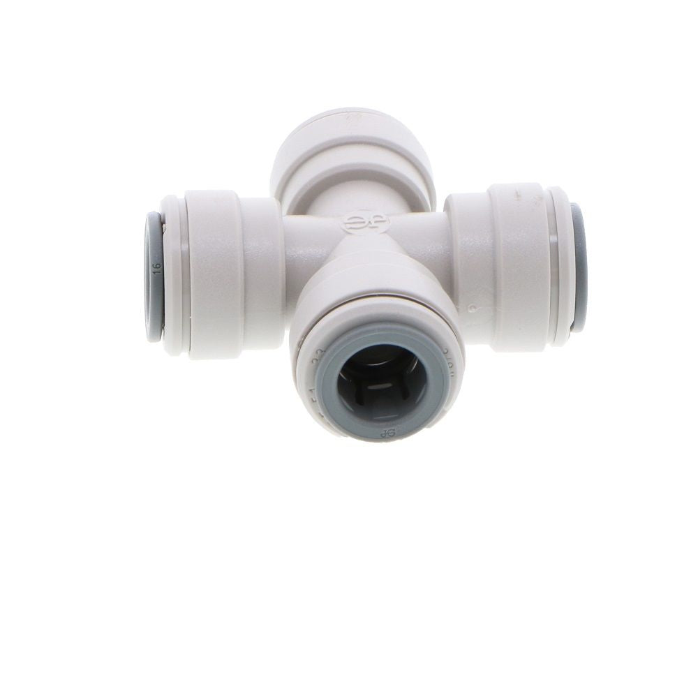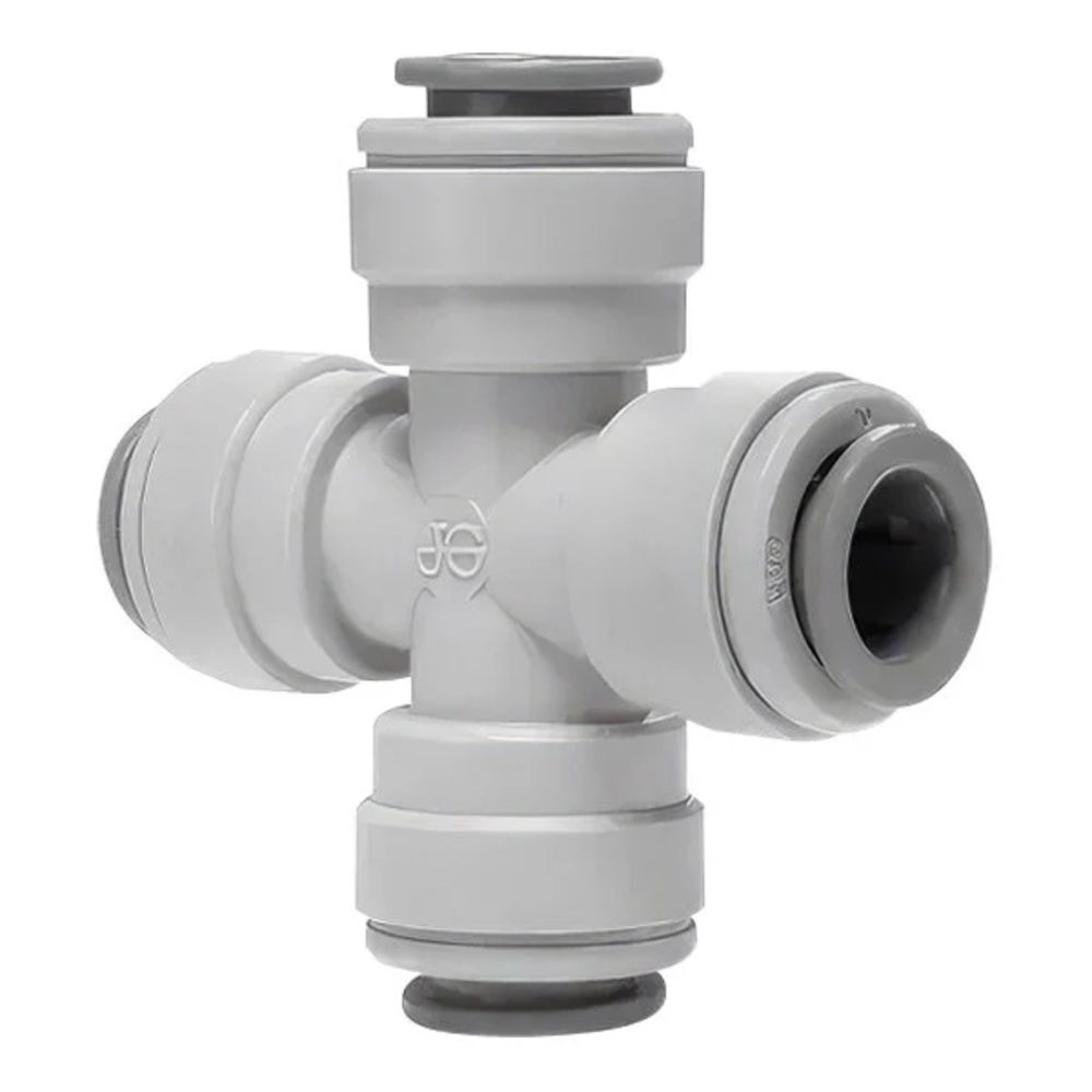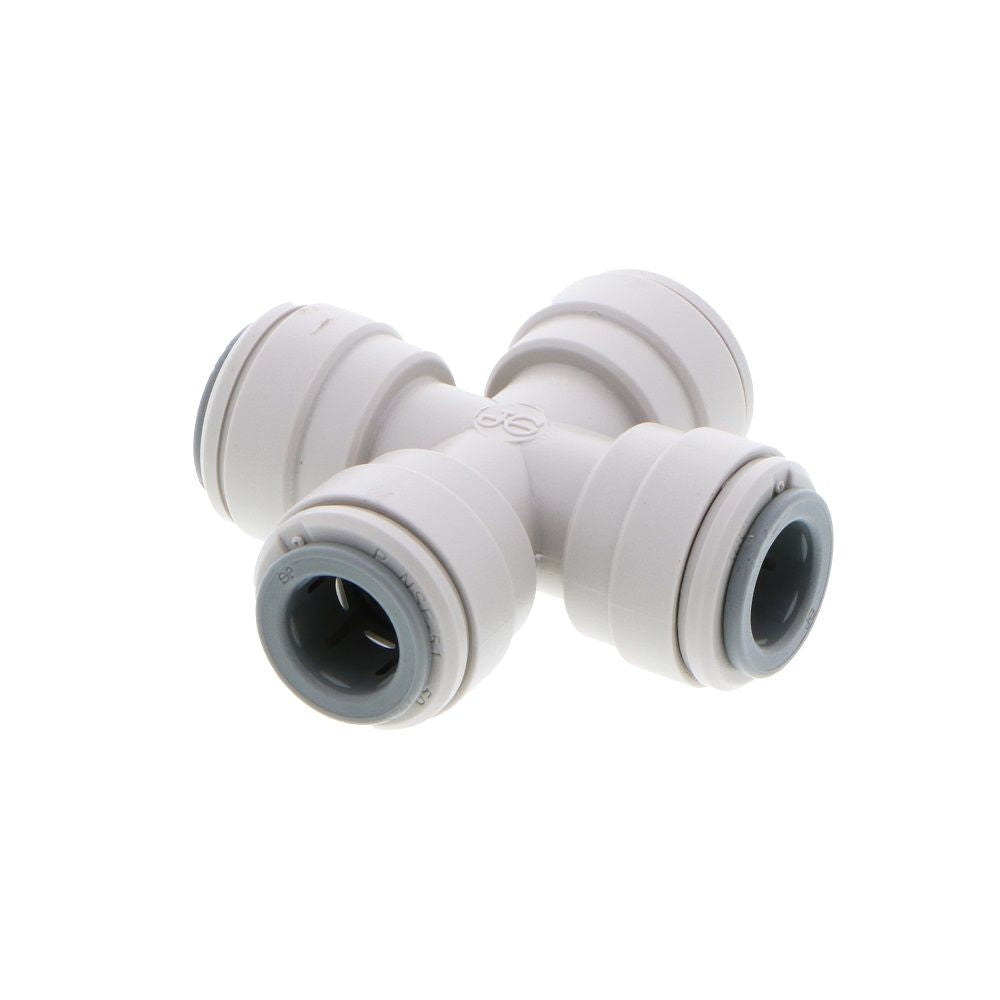 The John Guest cross is used to divide the flow into four flow paths. Manufactured in gray acetal with food grade nitrile O-ring, these fittings are suitable for food, beverage, and potable liquids. They are also suitable for air and inert gases therefore can be used for CO2 and nitrogen beverage gas lines, pneumatics, vacuum as well as other applications.