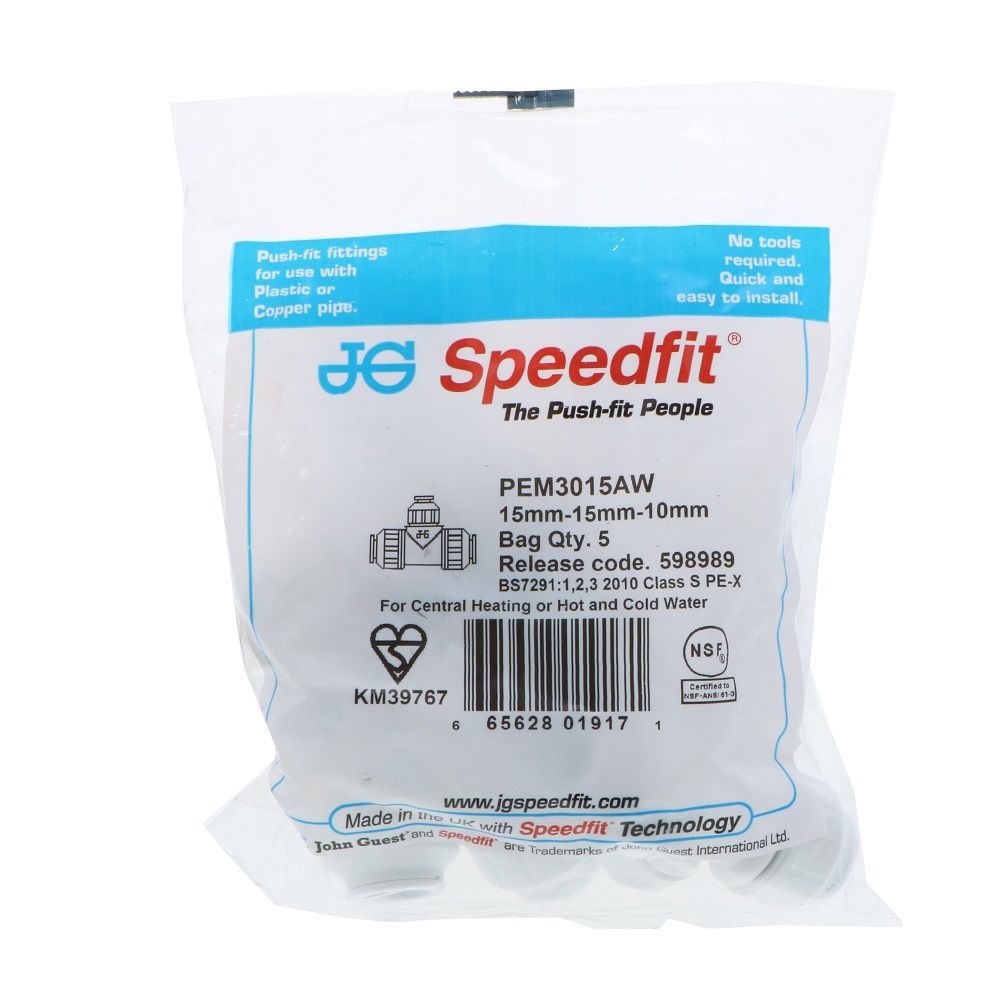John Guest Reducing Tee - 15mm x 15mm x 10mm