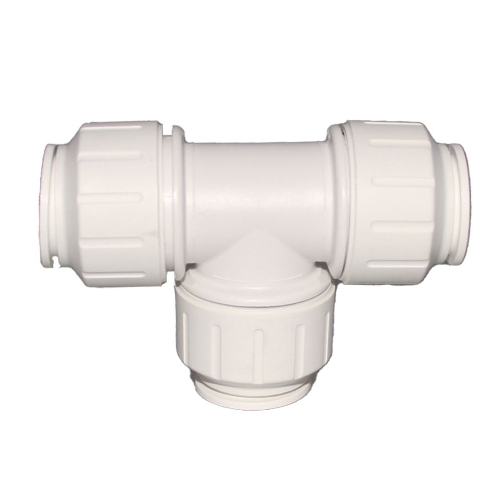 The John Guest Speedfit Union Tee push-fit fitting quickly connects three equal sizes of PEX or Copper pipe. Push the push-fit fitting fully onto the pipe and twist the plastic nut clockwise to lock in place. To disconnect, unlock the nut by hand and push the collet towards the body of the push-fit fitting and pull the pipe to release. The Speedfit tee is up to 40% faster to install than traditional methods and is easier to use in confined spaces by removing the need for hot works and tools.
