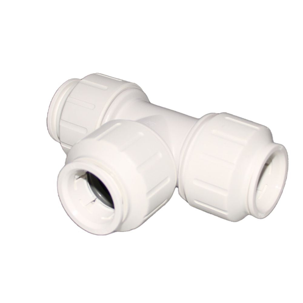 The John Guest Speedfit Union Tee push-fit fitting quickly connects three equal sizes of PEX or Copper pipe. Push the push-fit fitting fully onto the pipe and twist the plastic nut clockwise to lock in place. To disconnect, unlock the nut by hand and push the collet towards the body of the push-fit fitting and pull the pipe to release. The Speedfit tee is up to 40% faster to install than traditional methods and is easier to use in confined spaces by removing the need for hot works and tools.