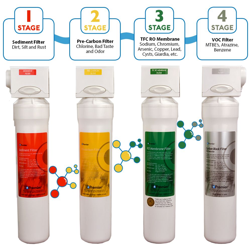 Four Stages of Advanced Filtration. The Watts Premier Reverse Osmosis System's four stages of filtration reduces sediment, particulate, chlorine, taste and odor, sodium, chromium, arsenic, copper, lead, cysts, giardia, VOCs, MTBEs, cryptosporium, atrazine, benzene, lindane and many other contaminants from your water.