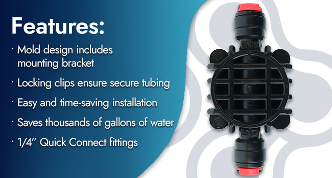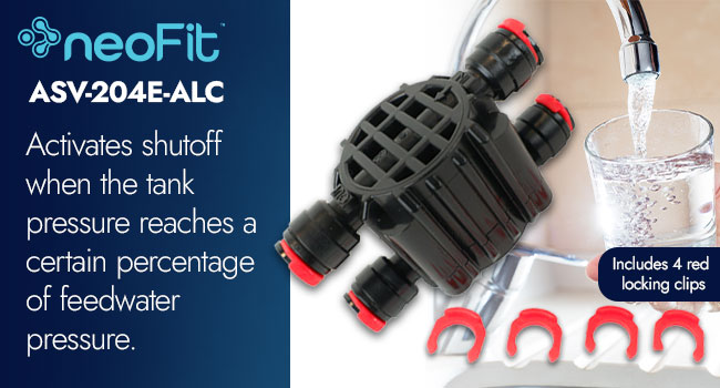 The ASV-204W-ALC Automatic Shutoff Valve is a compact unit that activates shutoff when the tank pressure reaches a certain percentage of the feedwater pressure. This model includes locking clips for secure tube connections.