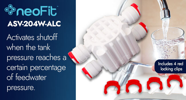 The ASV-204W-ALC Automatic Shutoff Valve is a compact unit that activates shutoff when the tank pressure reaches a certain percentage of the feedwater pressure. This model includes locking clips for secure tube connections.