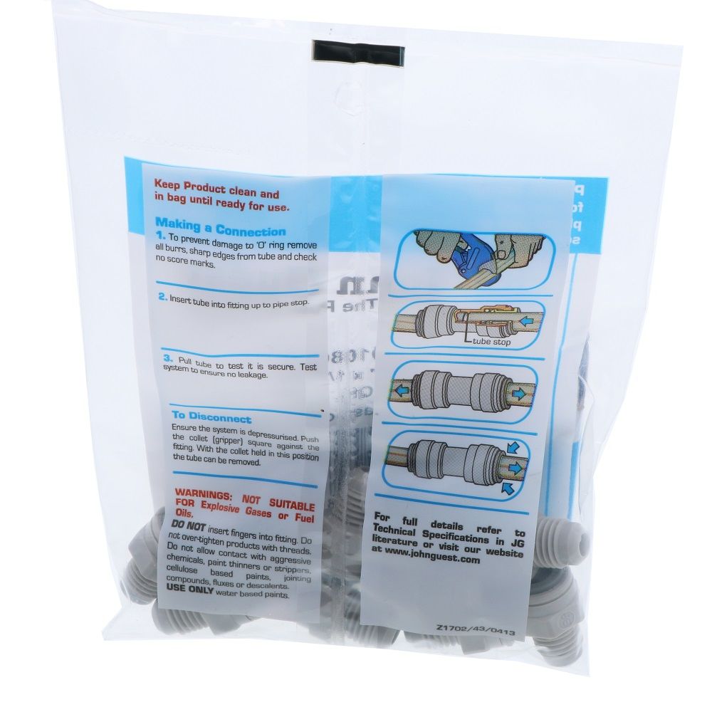 The John Guest Male Connector makes connecting tubing to female flare threads quick and easy. Fittings are manufactured in gray acetal with food grade nitrile O-ring, making them especially suitable for applications involving food and beverage and potable liquids. They are also suitable for air and inert gases and can be used on CO2 /nitrogen beverage gas lines, pneumatics, vacuum as well as other applications.