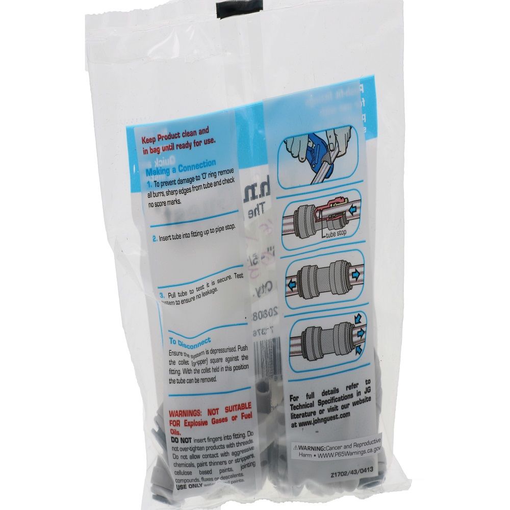 The John Guest elbow stem connector is used to connect OD tubing. The stem easily inserts into a John Guest push-fit fitting to change tubing 90 degrees. Fittings are manufactured in acetal with food grade nitrile O-ring, making them especially suitable for applications involving food and beverage and potable liquids. They are also suitable for air and inert gasses and can be used on CO2 /nitrogen beverage gas lines, pneumatics, vacuum as well as other applications.