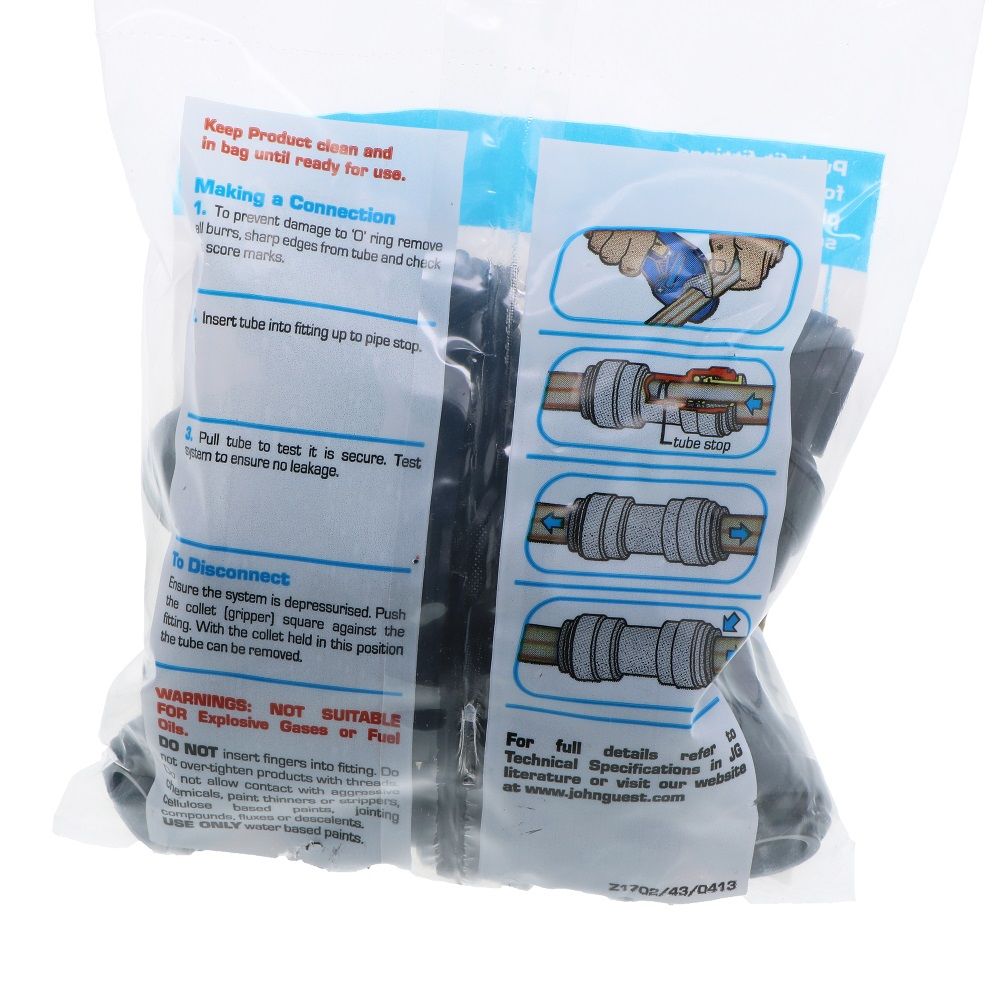 The John Guest push-fit Union elbow connects two equally sized pipes to form a 90° pipe bend. Fast and simple to install, John Guest push-fit fittings create an instant push-fit connection and leak tight seal without the need for tools, hot works or sealing agents.