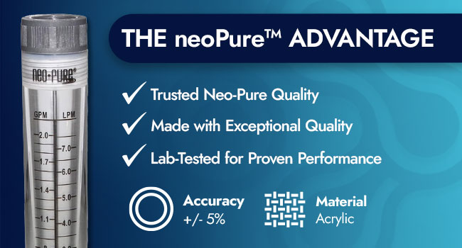Neo-Pure Panel Mount Flowmeters have easy-to-read scales, silk-screened onto the acrylic bodies, that are extremely accurate.