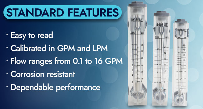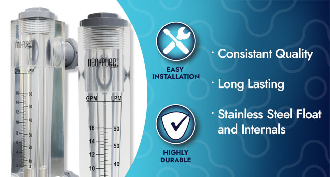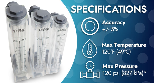 Neo-Pure Panel Mount Flowmeters have easy-to-read scales, silk-screened onto the acrylic bodies, that are extremely accurate.