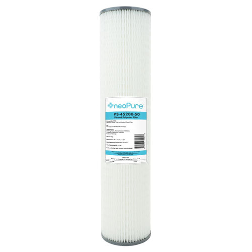 The Neo-Pure PS-45200-50 High Efficiency Pleated Filter is constructed out of 5 square feet of pleated polyester media wrapped around a polypropylene core for added strength and the ends are immersed in a thermo-setting vinyl plastisol. The polyester media reduces sediment, and provides excellent resistance to chemicals and bacteria.Features: