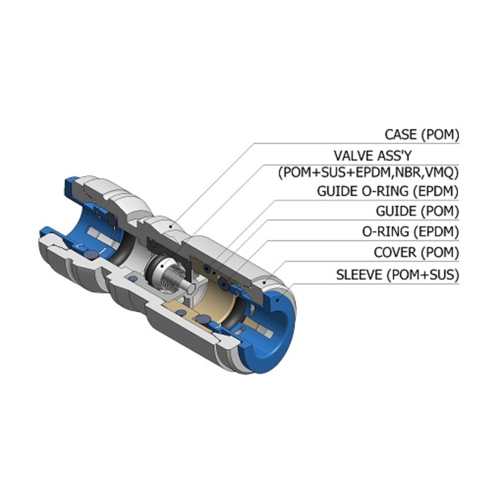 The check valve allows fluid to flow one way and prevents reverse flow. Manufactured in acetal copolymer with food grade EPDM O-ring, these fittings are suitable for pure water, potable liquids and other beverage applications.